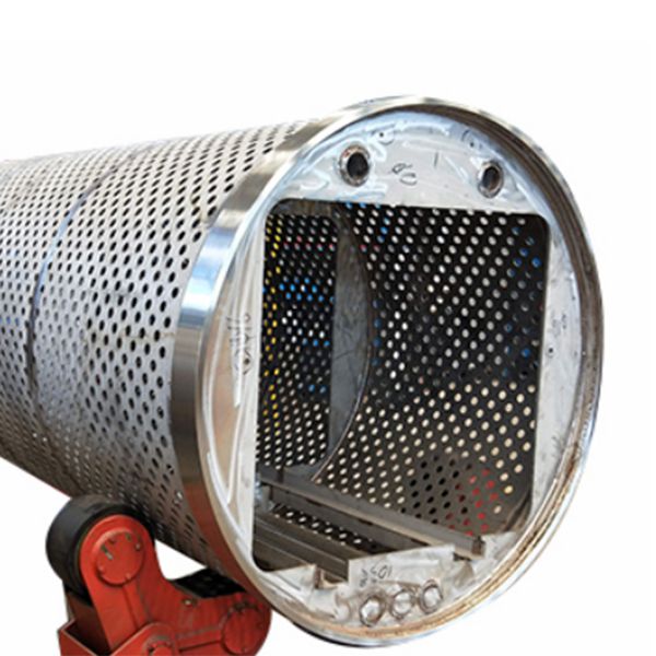 - La jaula rotativa está hecha de acero inoxidable perforado, tiene una estructura soldada integral, que garantiza una alta resistencia y buena resistencia a la deformación. La jaula rotativa se caracteriza por su diseño de soporte de tres puntos que es menos propenso a fallar que una jaula de soporte de cinco puntos, de esta manera se puede minimizar el tiempo de inactividad de la máquina y aumentar la productividad.