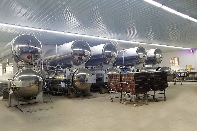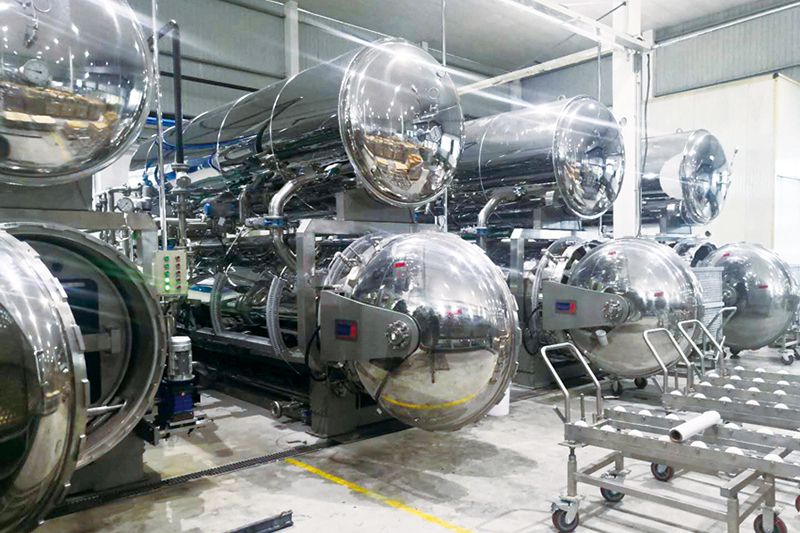 Las autoclaves rotativas (también llamados esterilizadores giratorios) se utilizan para esterilizar sopas instantáneas enlatadas, gachas de avena y otros alimentos semisólidos de alta viscosidad al rotar las latas y los recipientes durante el procesamiento. El esterilizador de alimentos gira lenta y continuamente a 360 grados para girar los alimentos enlatados dentro de la retorta, lo que resulta en el calentamiento y enfriamiento uniforme del contenido de los alimentos. Esta autoclave por lotes agita las latas y los envases de forma exhaustiva mediante la rotación para aumentar la transferencia de calor por convección, de modo que el tiempo de procesamiento puede reducirse significativamente. Asimismo, utiliza control preciso de la temperatura y la presión para garantizar la integridad del sellado de las latas y envases esterilizados sin causar deformaciones ni daños por el calor.